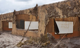 As poucas casas ainda de pé, em ruínas e destelhadas, têm as janelas
